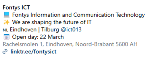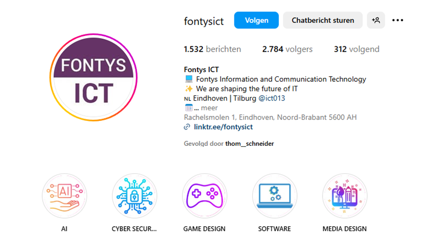 Also, the usage of the biography is correct; clear information with a linktree to all the links u need if you're interested in Fontysict. This is definitely a good platform to post video's on for the minor Visual Production.