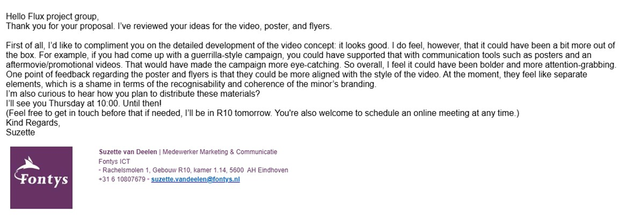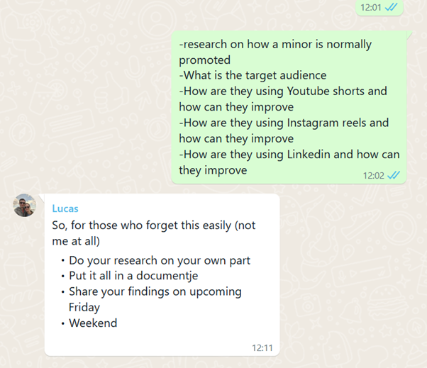 For the group project we chose Fontys minor marketing about Virtual Production. This choice was made based on our strengths and preferences, and this was our first pick out of all the presentations we had for all the options. After getting the thumbs up on the Marketing for the minor Virtual Production we sent the Client a message to ask if we can meet them and ask them questions about what they expect us to make.