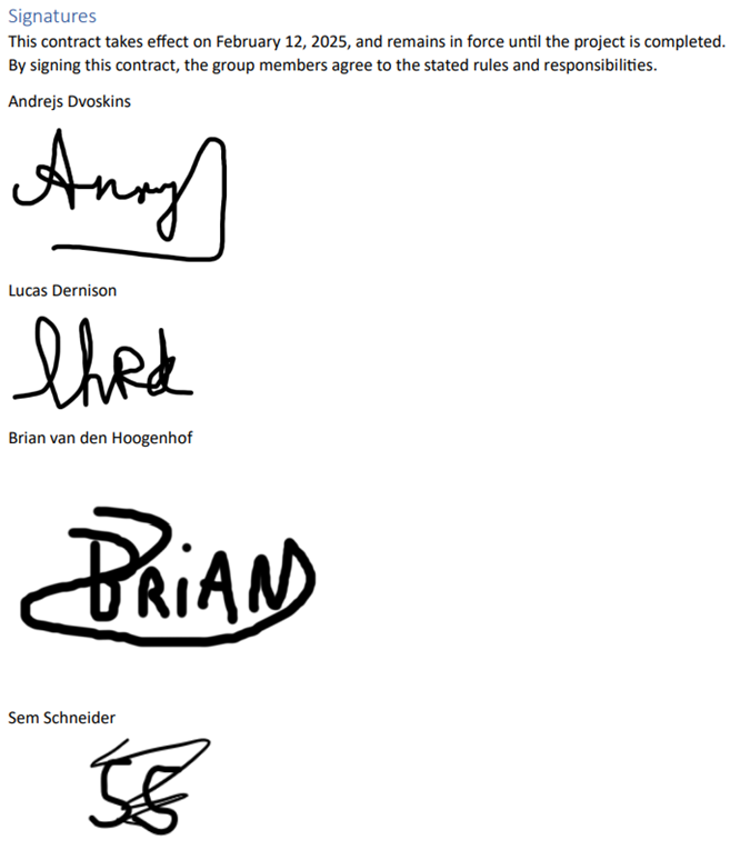 Reflection on Collaboration Contract: Looking back, the collaboration contract helped set clear expectations early on, especially around communication and attendance. In practice, most of us stuck to these agreements, and the WhatsApp group made quick updates easy. However, we didn’t always hold each other accountable when someone broke a rule, like being late without notice. In future projects, we could improve by revisiting the contract midway through the project to reflect and adjust if needed. Speaking for myself my communication was always spot on. Even if i was 5 minutes late I let the group know and gave them a clear reasoning for it, I think I handled my communication very Professionaly this semester.