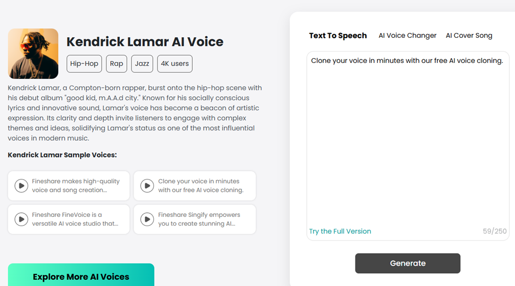 This is where you enter the text you want converted to sound in the voice of Kendrick Lamar. You are limited to a few thousand words and everytime you generate it changes a bit so I did a lot of generating and created a lot of accounts :D